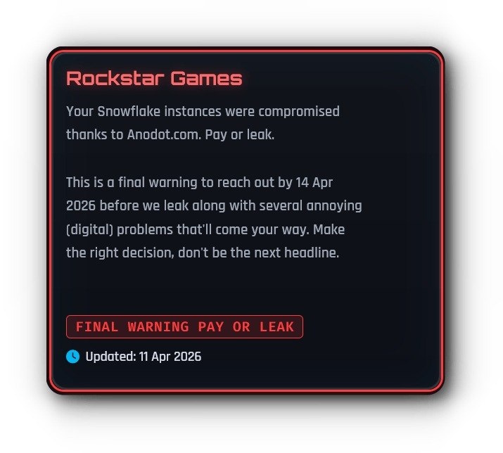 Хакеры требуют выкуп до 14 апреля. Группировка ShinyHunters заявила о взломе Rockstar Games и пригрозила сливом данных. Rockstar подтвердили утечку, но уточнили: взломали стороннего подрядчика, утекло немного, ничего ценного. По одной из версий, токены аутентификации мог слить бывший сотрудник. GTA 6 ещё не вышла, а утечки уже стали традицией.