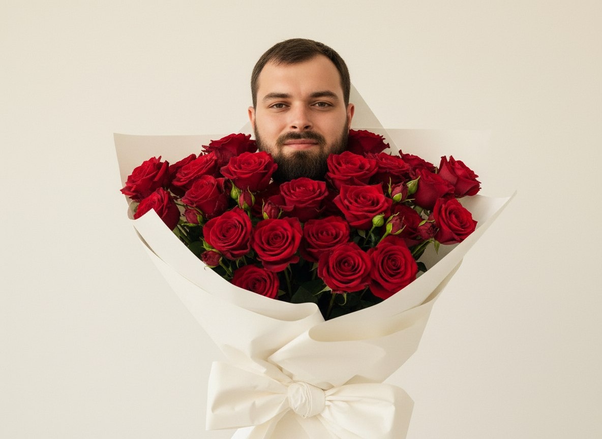 Use the uploaded image as a strict visual reference for face, proportions and hairstyle only. Do not change the identity. Do not add new elements. Do not reinterpret the concept. Create a high-end conceptual fashion photograph. Core concept (CRITICAL): The man is physically embedded inside the bouquet. He is not standing behind it. He is not placed in front of it. The bouquet surrounds his head from all sides. The flowers partially overlap his neck and jawline. There is a clear illusion that his body continues downward inside the bouquet. The bouquet visually replaces his torso. Composition: Vertical frame. Large negative space above. The bouquet fills the entire lower half of the frame and extends upward around the head. Flowers are layered in front of, around and slightly over the edges of the face. No visible gap between head and flowers. Subject: Only the head is visible. Head emerges directly from the center of the bouquet. Neck is almost полностью скрыта цветами. Head slightly raised, centered within the flowers. Gaze directed straight into the camera. Expression soft, warm, gentle. Subtle relaxed smile, barely noticeable. Eyes calm, open, emotionally inviting. Flowers: A dense bouquet of red roses. Strong natural variation in size, openness and shape. Some roses are large and fully open. Others are smaller, tighter, partially closed. Petals have irregular edges, folds and natural imperfections. Subtle variation in red tones: deep crimson, muted red, darker wine оттенки. Small green buds, stems and leaves appear organically between flowers. The flowers overlap each other densely, creating depth and thickness. Wrapping: Oversized white matte paper. The wrapping is wide and sculptural. It forms a large volume capable of visually containing a full human figure. Layered folds with natural creases. A large, loose bow at the front, asymmetrical, soft. Lighting: Soft diffused studio light. Even illumination across face and flowers. Very gentle shadows inside the bouquet to enhance depth. No harsh contrast. Light emphasizes petal texture and paper folds. Color palette: Deep natural reds (flowers), soft white (wrapping), warm off-white (background), natural skin tones. Camera & framing: Medium shot. Straight-on camera angle. Lens equivalent: 50mm. Natural perspective, no distortion. Style & mood: Conceptual editorial fashion photography. Minimalistic, poetic, slightly surreal. Clean gallery aesthetic. Not illustration. Not painterly. Post-processing: Light film grain. Soft contrast curve. Skin texture preserved. No heavy retouch. No vignette. Do not add text, logos, watermarks or extra props.