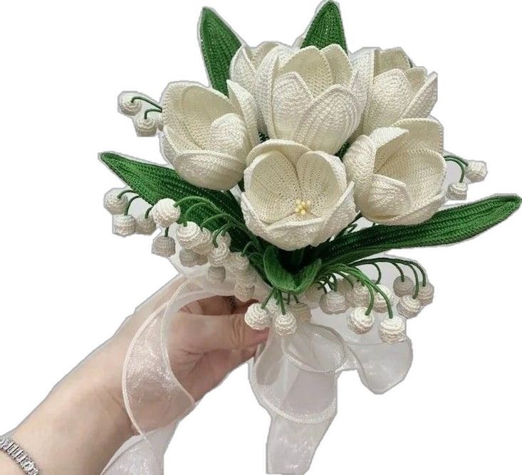 Цены на вязаные свадебные букеты варьируются: от 2000 рублей (простые, 3–5 цветков) до 15000 рублей (сложная авторская композиция из 15–20 цветов с бусинами и брошами). Если вы вяжете сами — затраты только на пряжу и проволоку (около 500–1000 рублей). Времени уйдёт много: один реалистичный цветок может занимать 2–3 часа.