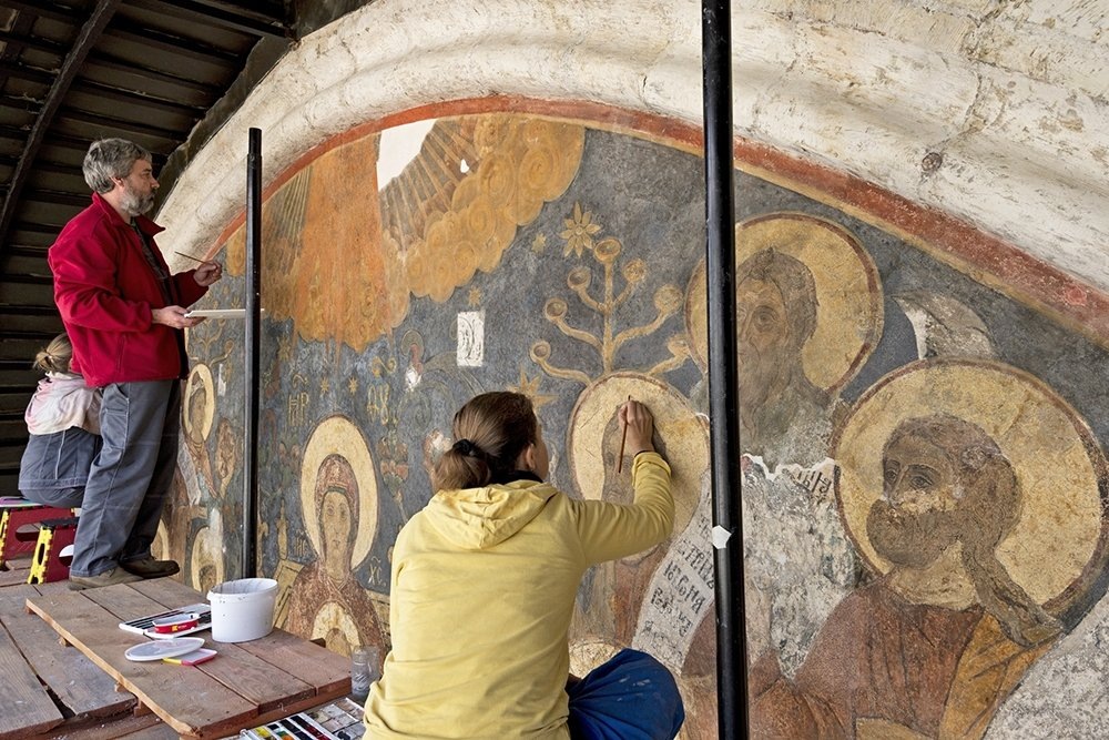 Этот этический императив сформирован, в том числе, горьким опытом прошлых неудач. Например, в 1930-х годах для укрепления фресок Андрея Рублева и Даниила Черного в Успенском соборе Владимира использовался казеиново-силикатный клей. Образовавшаяся жесткая пленка со временем привела к растрескиванию и осыпанию драгоценного красочного слоя.