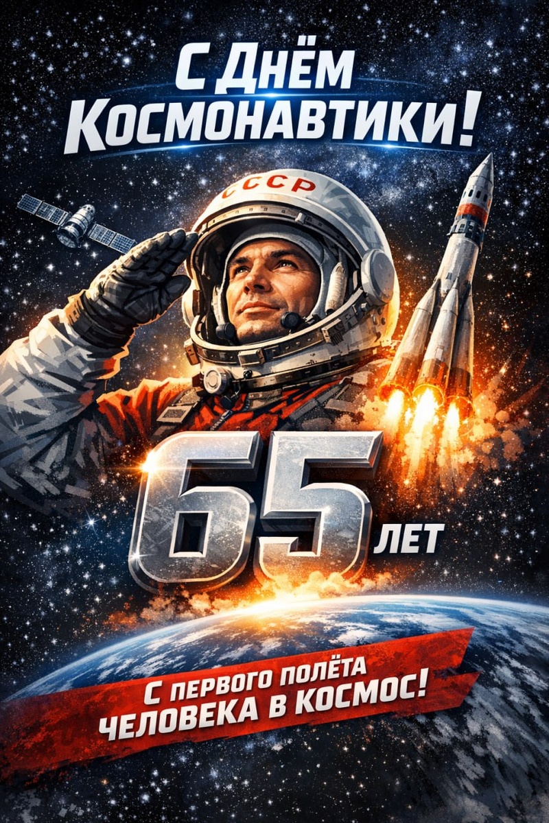 ! 🚀 Сегодня мы отмечаем 65 лет со дня первого полёта человека в космос — события, которое навсегда изменило историю человечества. Пусть этот день вдохновляет на смелые мечты, большие цели и новые победы! С праздником! 🌍✨