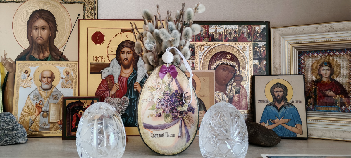 Добрый день! Поздравляю всех христиан с праздником светлой Пасхи! Христос воскресе! Моя пасхальная сервировка в этом году скромнее, потому, что в доме маленький ребенок-моя внучка. Ей все интересно потрогать, помять. постукать))). Ребенок познает мир. Поэтому, чтобы всем было хорошо, комфортно и радостно-сервировка такая. Хрустальные яйца и фужеры, фарфоровые зайчики и ангелочки- все пока на полках стеллажа. А мои любимые весенние тарелки с сиренью на столе! Для внучки тоже пасхальная салфетка, которую вышила Маруся. Солнышко сегодня проглядывает сквозь плотные облака, но мандарины добавляют цвет! Куличи пекли не сами. У сына на работе повара испекли немного. Всем здоровья, радости и мира!