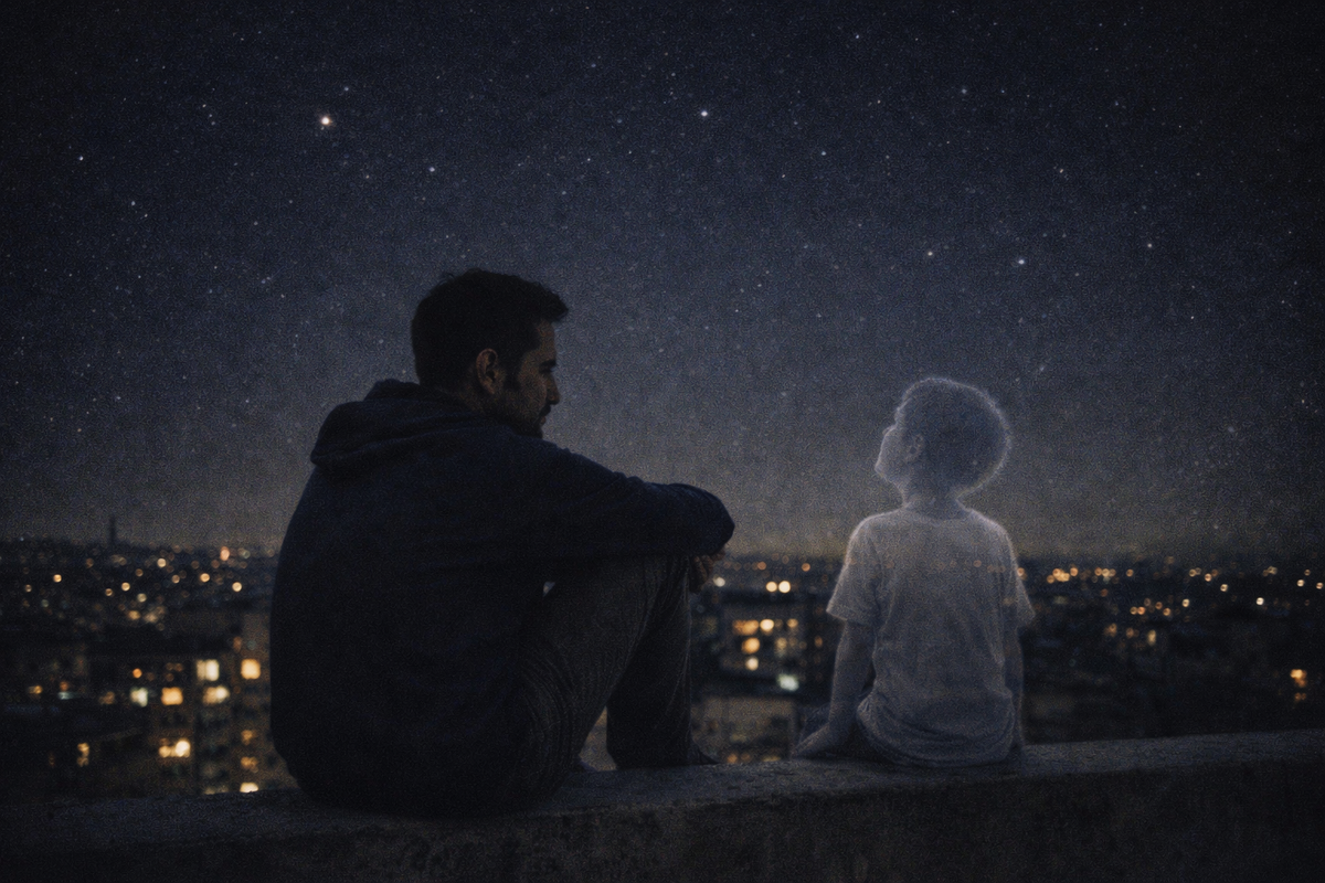 Город лежал внизу, тихий и темный. Окна горели редко — желтые прямоугольники в черных коробках домов. И над всем этим — небо. Не такое, как в детстве, конечно. Городская засветка съедала половину звезд. Но те, что остались, горели ярко и чисто.