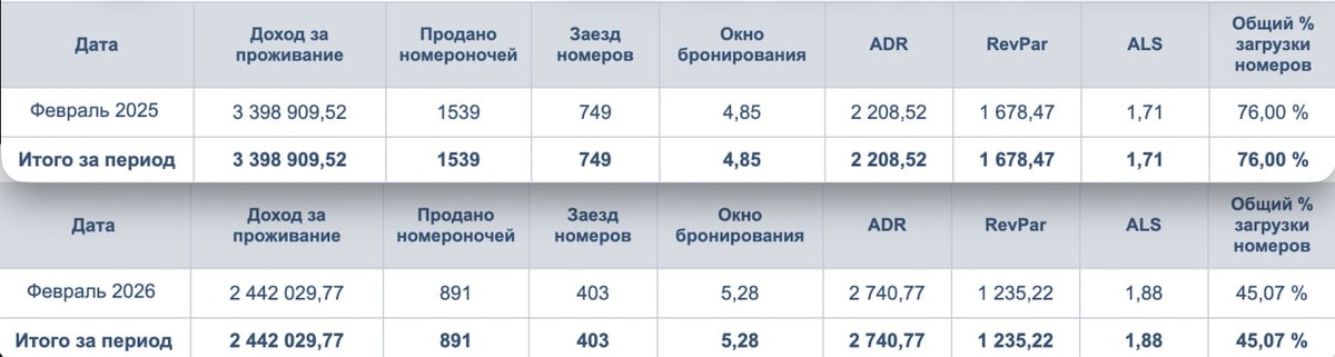 #отчетпозагрузке Когда есть достижения - все о них говорят. Когда есть провалы - их скрывают. Так устроена человеческая психика. В чатах коллег я редко встречаю откровенные признания о том, что у кого-то последние несколько месяцев бизнес работает в убыток. Зато в личку пишут постоянно. Наши клиенты косвенно об этом заявляют. Да и что там говорить - все всё понимают. Итоги февраля 2026. Без прикрас. 📉 Загрузка рухнула до 45%. Это рекордно низкий результат. Такого у нас никогда не было. 📉 Выручка почти на 1 млн рублей ниже. Но есть и плюсы. Цену мы не роняем. Средний чек выше на 500 рублей. Как я писал в отчёте за январь: не стоит ждать роста загрузки. Будет только падение. Поэтому важно управлять доходностью и работать над качеством номерного фонда. Прогноз оказался точным. К сожалению. Что дальше? В следующем посте покажу, к каким последствиям это привело в компании «Две Подушки». Спойлер: пришлось перестраивать процессы и номерной фонд. А как ваш февраль? Поделитесь пок
