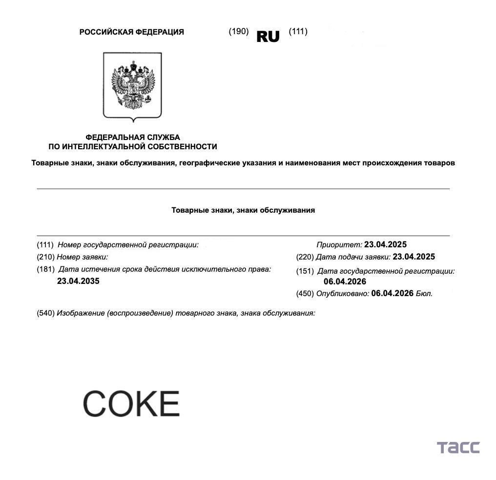 TASS says the Coca-Cola Company has registered the Coke trademark in Russia, opening the door to new business