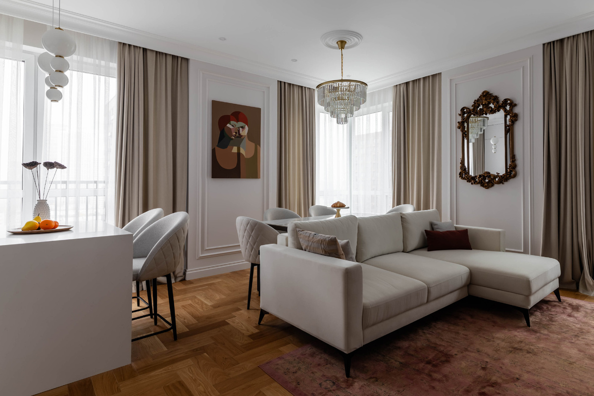 Изначально задуманная как инвестиционный проект, эта квартира обрела утончённую эстетику своего куратора — молодой девушки, чей вкус чувствуется в каждой детали. Здесь элегантность идей идет рука об руку с практичностью решений. В изначальной планировке предполагались кухня-гостиная, две отдельные комнаты (спальня и будущая детская), а также два санузла. Дизайнер предложила выделить в прихожей гардеробную, забрав часть площади кухни. А также немного увеличить второй санузел за счет коридора, чтобы уместить душевую.