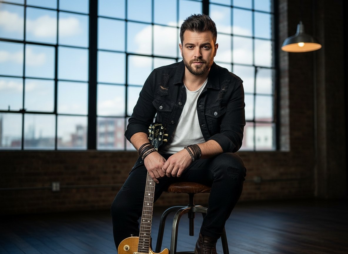 Используй лицо мужчины с загруженного фото. 9:16. Мужчина сидит на высоком металлическом стуле с кожаным сиденьем на фоне большого окна в индустриальном лофте. На нем черная джинсовая куртка с потертостями, под ней — простая белая футболка. На руках — несколько кожаных браслетов. Легкая небритость, волосы уложены в небрежную текстуру. В руках — электрогитара, установленная вертикально на полу, одна рука лежит на грифе. Свет смешанный: холодный дневной из окна и теплый ламповый сверху, создает интересный контраст на лице и инструменте. Настройки камеры: Phase One IQ4 с объективом 80 мм f/2.8. Диафрагма прикрыта до значений f/2.8–f/4 для достижения оптимальной глубины резкости. Фокус установлен на лице мужчины и руке на грифе гитары. Баланс белого настроен на смешанный свет с сохранением контраста между теплыми и холодными оттенками. Формат съемки — RAW с максимальным динамическим диапазоном для последующей цветокоррекции. Негативный промпт: плоское освещение, пересветы, провалы в тенях, отсутствие текстуры кожи, пластиковый эффект, искусственное сглаживание, грязные тона, искажения перспективы, лишние предметы в кадре, глянцевая beauty-ретушь, отсутствие атмосферы, холодная стерильность, неестественные позы.