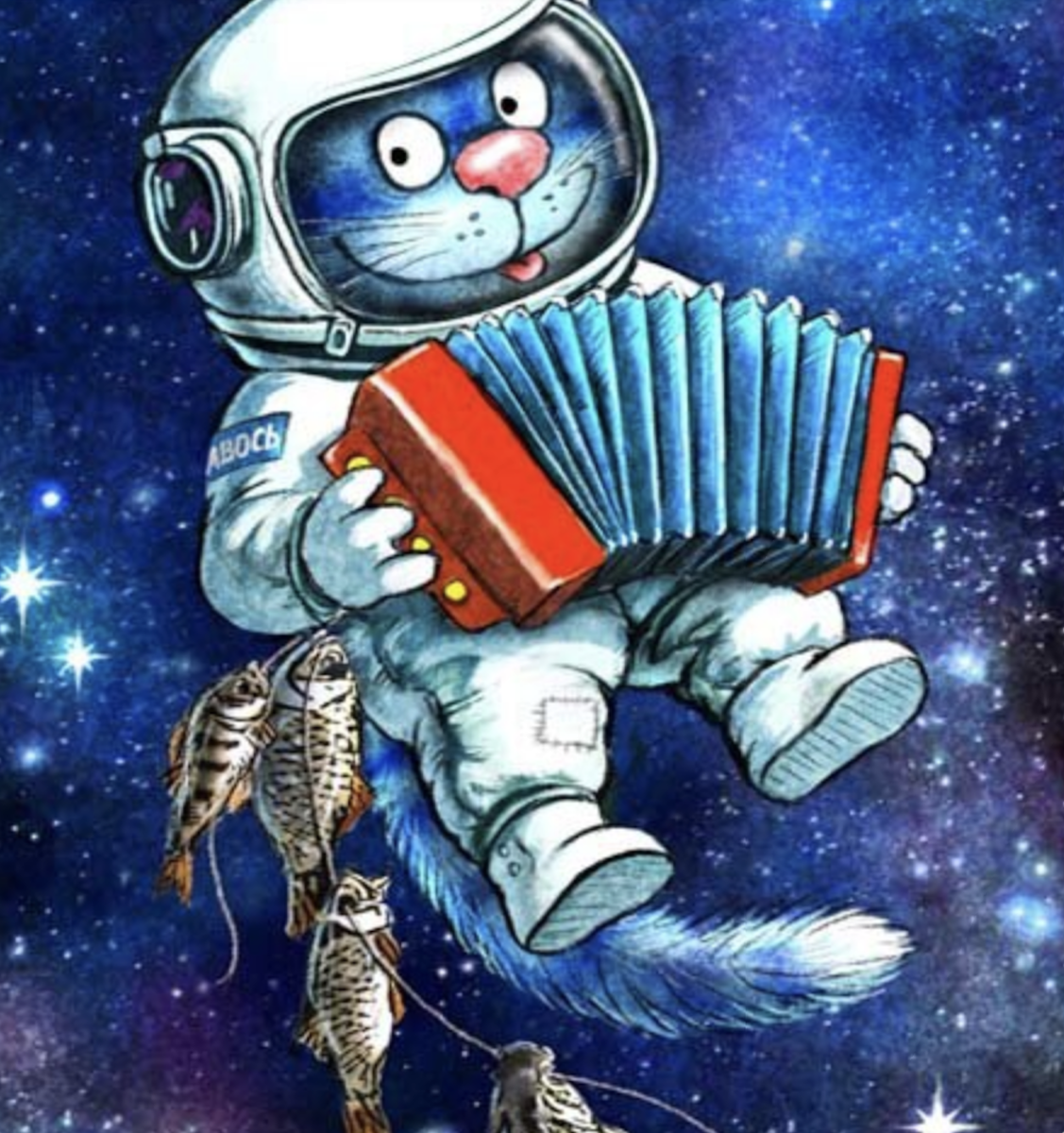 Всем добрый день! У замечательной художницы Ирины Зенюк есть серия картин - открыток про синего кота Ваську, мечты которого сбылись и он побывал в космосе. Недавно его корабль под русским названием "Авось" прибыл с экспедицией на Луну и оставил на "пыльной" планете свои и кошачьи "следы". Вечером, затосковав по земным радостям, Васька замурчательно спел под гармонь знаменитую песню на стихи Евгения Долматовского с красивыми словами: "И на Марсе будут яблони цвести..." , что тоже относится и к другим планетам. Вот так. Кошка Мурка очень загордилась своим Васькой, надоила ему молока 4-х процентной жирности у коровы Звездочки и встретила своего героя после полета вкусными угощениями. Конечно, все было вкусно , но Ваську больше привлекала сушеная рыбка к пиву, но чтобы не обидеть любимую Мурку он тщетно грыз сушки с маком. Конечно, слетать в космос и увидеть звезды хорошо, но дома всегда лучше, теплее и угощательнее. Человечество еще до Васьки давно мечтало освоить космос не