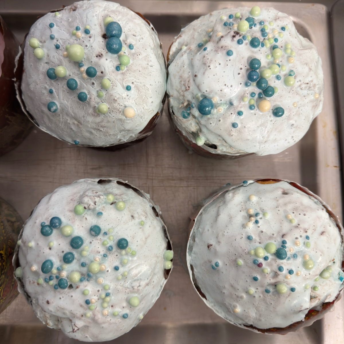 На фото мои куличи… часть пекла вчера, часть позавчера… сделала 3 вида: с зеленой глазурью это творожные куличи (внутри с шоколадом,цукатами, кешью (перемолотые). Их я пекла по новому рецепту). С бабочками: это стандартные куличи с цукатами и изюмом и бирюзовые это