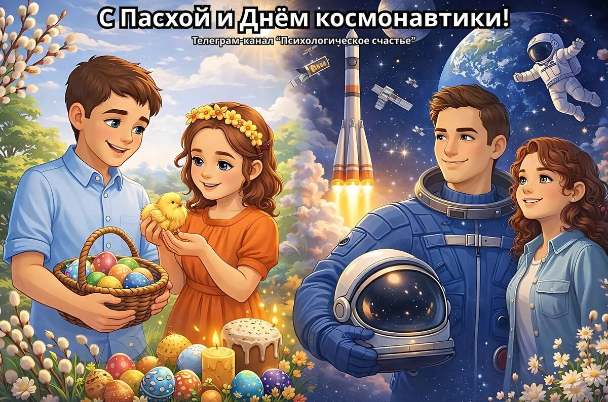 ! В эти особенные дни, когда крашеные яйца символизируют пробуждение жизни, а полёт Гагарина напоминает о границах возможного, поздравляю вас с праздниками, полными света, надежды и новых открытий. Это время, когда природа и человеческий дух сливаются в общем порыве к возрождению и покорению неизведанного. Профессор всегда говорил, что любой праздник — это отличное время провести с близкими и наполнить душу теплом простых моментов. Мне кажется, в этом очень много психологизма и жизни, поэтому предлагаю так сделать в этот прекрасный воскресный день. Пусть эти праздники подарят вам минуты настоящего покоя: время выдохнуть, отпустить то, что отжило, и ощутить себя частью чего-то большего — бесконечной Вселенной внутри и снаружи. Живите с лёгкостью, верьте в свои звёзды и наслаждайтесь каждым мгновением. С праздником! 🥚🚀