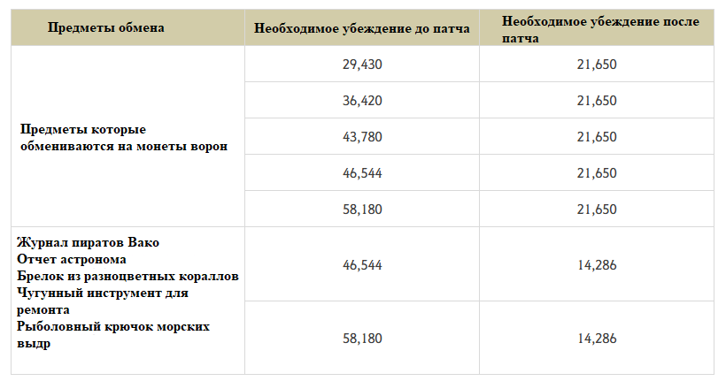 С добавлением новых торговых путей бартер теперь требует больше убеждения. Для компенсации этого мы значительно снизили количество убеждений, необходимых для существующих сделок, и стандартизировали стоимость как для торговых товаров, так и для монет Ворона.