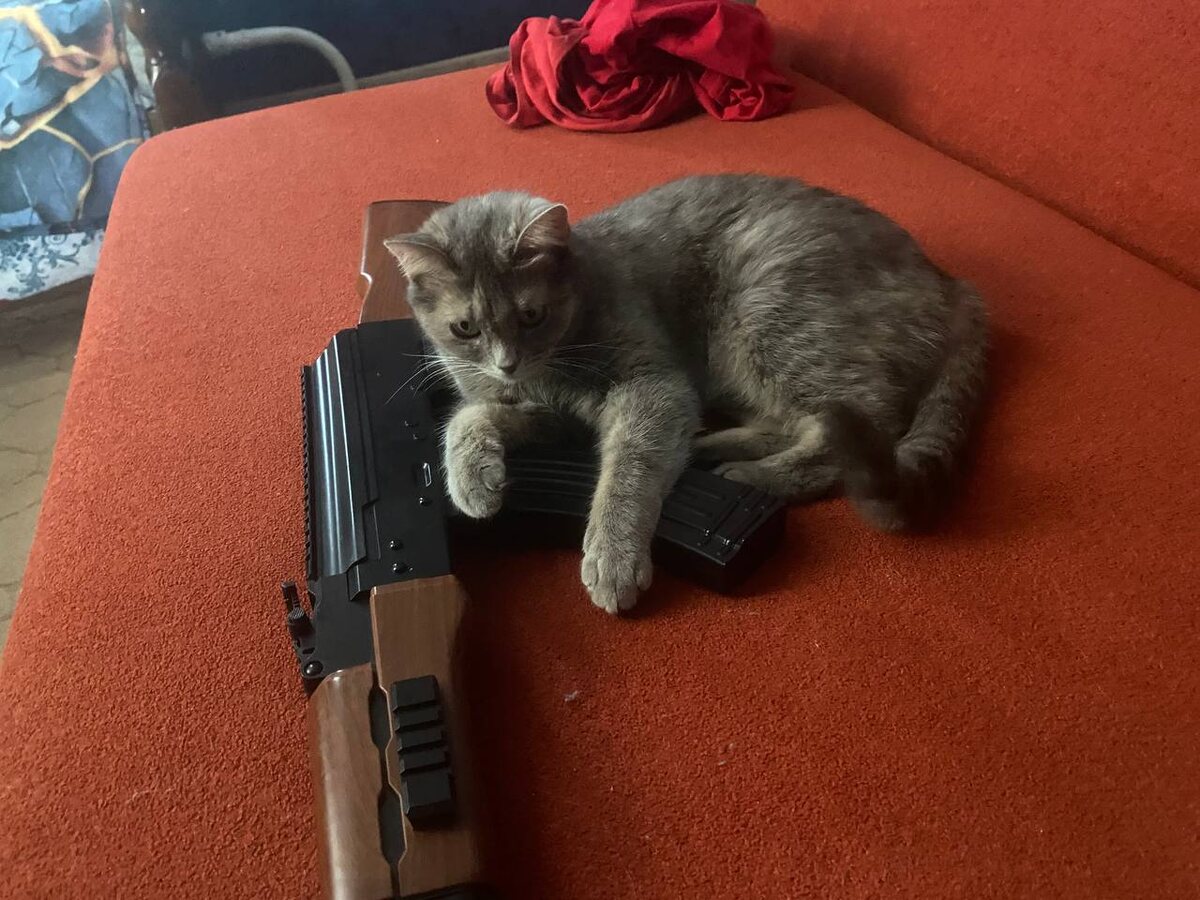 Всё случилось совершенно случайно. Никакой постановки, никаких «давай, Юля, попозируй». Просто обычный вечер в нашей квартире. Сын положил свой игрушечный автомат Калашникова на диван в своей комнате — макет как настоящий, размер в размер, солидный такой. И ушёл по своим делам. А через час я заглянула в комнату и замерла. На диване, аккуратно растянувшись, спала Юля. Рядом с автоматом. Лапа на прикладе, нос у ствола. И вид у неё был такой, будто это её личное, законное оружие. Рассказываю, как это было. Сын у нас уже взрослый, но игрушки у него бывают разные. В том числе и вот этот муляж АК — страйкбольный или сувенирный, точно не скажу, но выглядит внушительно. Тяжёлый, детали проработаны, ремень есть. Сын иногда берёт его в руки, крутит, разбирает-собирает, играет. В тот день он просто положил автомат на диван — ровно посередине. И ушёл. Юля в это время гуляла по дому. Она у нас кошка свободного выгула, где хочу, там и гуляю.