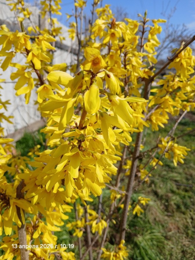 Продолжаю обзор цветущих деревьев в саду. Эту форзицию муж отковырял мне прутиком где то в зарослях на обочине, на фото с мужем ей уже пара годиков, на фото выше такая она сейчас. Каждый год подрезаю её в форму шарика. Форзиции у нас две. Второе деревце хочу оставить небольшим и на одном стволе но она как то снизу сразу разветвляется и пока не знаю как к ней подступиться. Поселила их в плодовом саду за красоту, пока раскачиваются и зацветают плодовые и сад ещё достаточно голый она сияет на солнце золотым облаком. Хеномелес взят из тех же зарослей, что и форзиция. Что то в эту весну он долго раскачивается, обычно полный цвет вместе с форзицией и набирает. А растёт он под церцисом. Церцис - это такое дерево или кустарник, в которое влюбилась заочно по фотографии и не успокоилась пока не заполучила его себе в сад. Далее в этом ряду стоит боярышник и вчера посадили в добавок жасмин. Очень уж шикарный у него аромат, да и цветёт он не хуже всех прочих. Так что в наших рядах прибыло новеньк