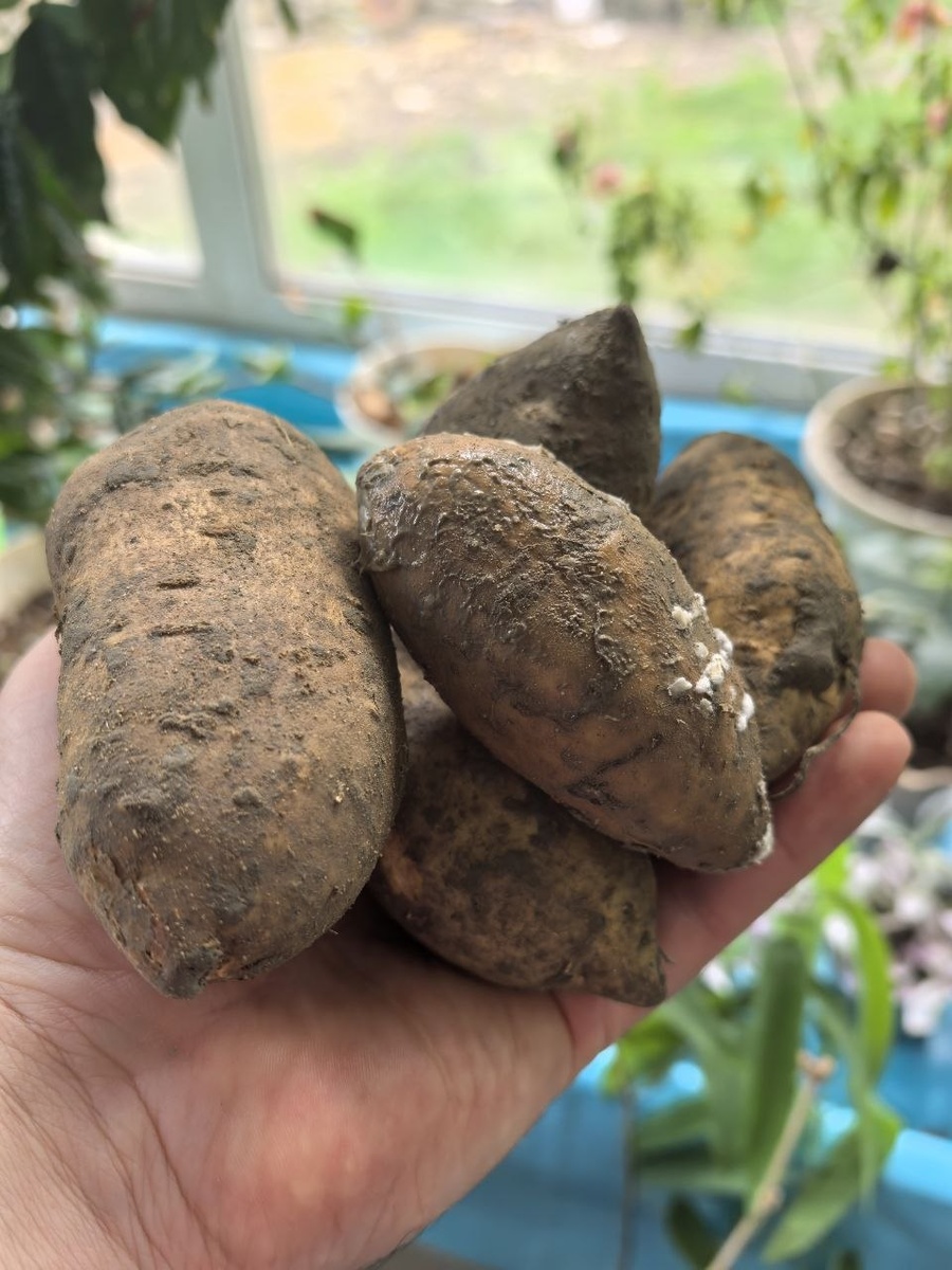 Сорт называется Жёлтое Сердце. Удивительно, но у них скорее всего нет культуры мытья батата. Когда доставали из пакета, да да, не удивляйтесь, абсолютно не упаковывают, а просто засыпаны в пакет, очень было не приятно. Влажные, грязные... Пока шел попал в холод. Из 5 клубней осталось 2,5. Остальные пропали. Попробуем прорастить, вырастить и посмотреть урожай. По секрету скажу, попробовали - сладенький, напоминает вкус каштана. Но на срезе темнеет очень быстро. + Новый сорт к коллекции😉❤️💞 #батат #бататчудо #клубнаядача