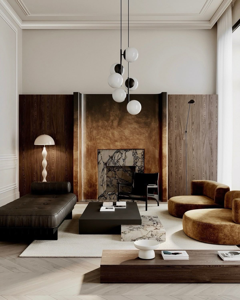 - Гостиная (акцентная стена, каминный портал, пол — если тёплый пол, иначе холодно).