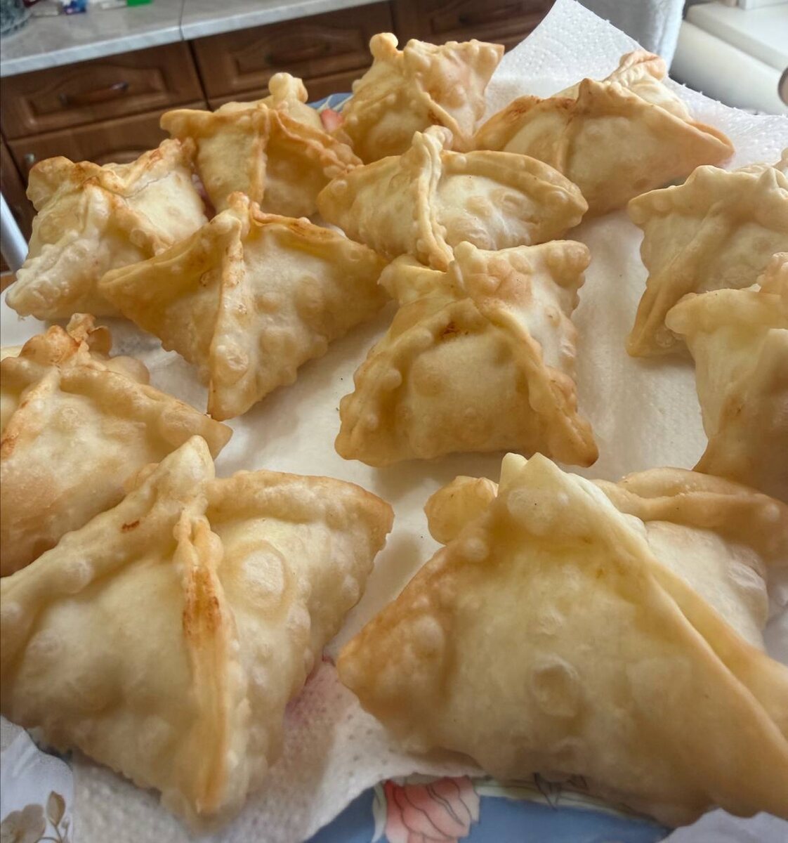 Камыр өчен: 120 гр кипятокка ярты чәй калагы тощ 1 -2 аш калагы көнбагыш мае 250 гр он салып камыр ясап, ял иттерәбез. Эчлек өчен: Бәрәңгене тозлы суда пешереп , сөзеп,сөтен, маен салып төябез. Камырны юка итеп җәябез, бәләкәй квадратлар кисеп, эчлек салып, ябештереп, кызган майга салып алабыз