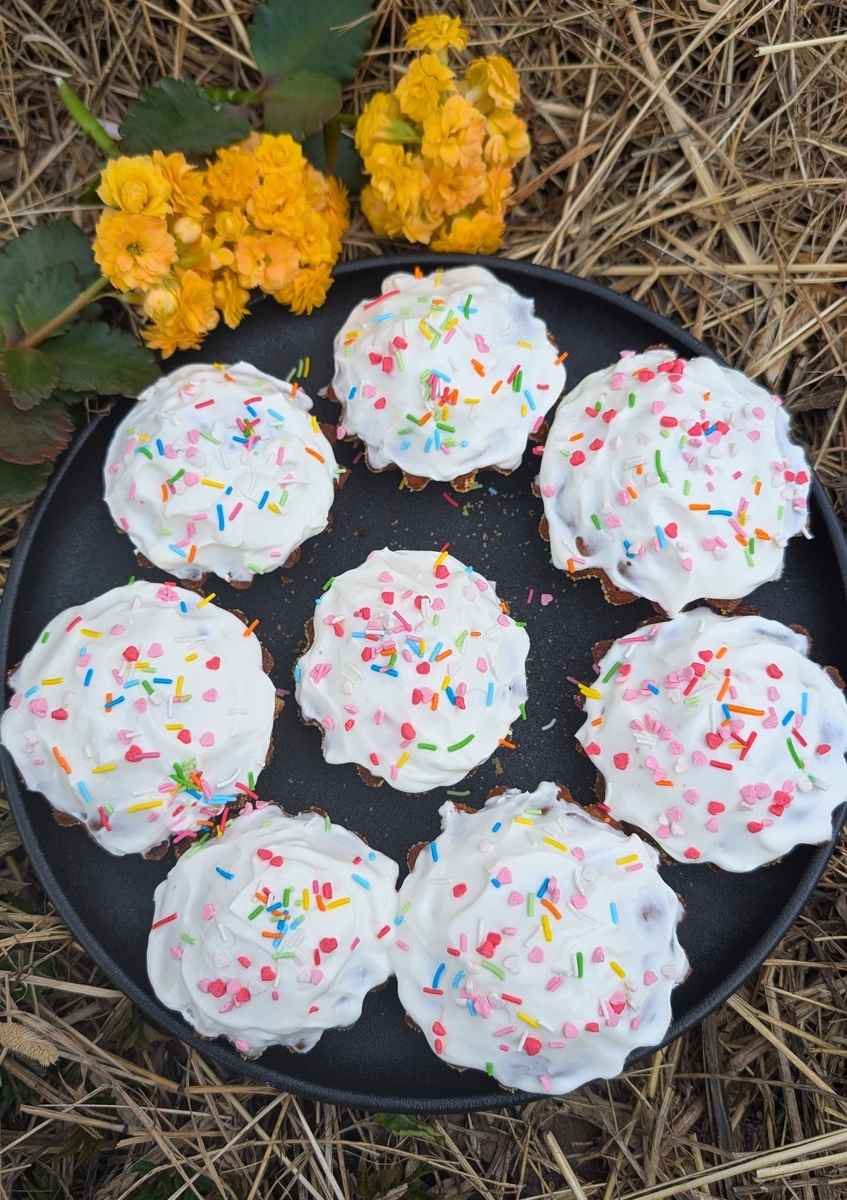 Всех поздравляю с праздником Светлой Пасхи! Обычно в этот день к нам приезжают гости, чтобы всем вместе исполнять семейные традиции, "кокаться" яйцами, например. Сегодня к нам с женой приехали дочка с внучкой. Мы вместе готовили праздничную еду: пекли куличи и красили яйца. Я в основном только пробовал :) В этом году решили большой кулич не выпекать, а испечь мини-куличики (кексы). Рецепт взяли из кулинарной книги 1955 года. Публикую практически дословно: Стереть масло с сахаром так, чтобы масса получилась пышной и сахар растворился, а затем прибавить яичные желтки, затем муку, всё это перемешать и добавить яичные белки взбитые в пену. Полученное тесто переложить в маленькие металлические формочки и выпекать в духовке 15-20 минут. На два стакана муки 150 г масла, стакан сахара, 6 яиц, ванилин. Получается просто, но очень вкусно, только суховато, поэтому вместо глазури решили использовать сметану. Ну и посыпкой конечно же украшала внученька. Яйца красили двумя способами. Первый клас
