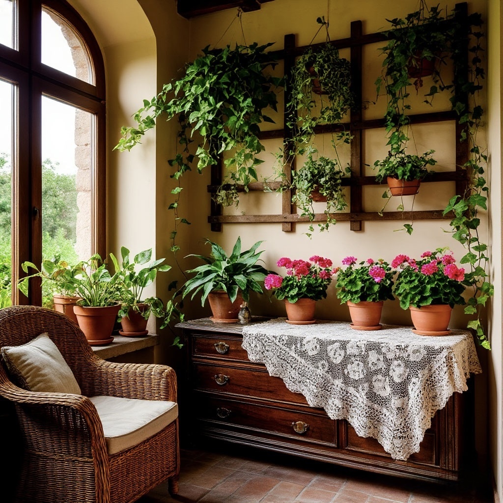 3. Старые вещи в новой роли — бабушкин комод, плетёное кресло, кружевная скатерть. Не выбрасывайте, переставляйте. Они могут стать главными героями вашего зелёного уголка.