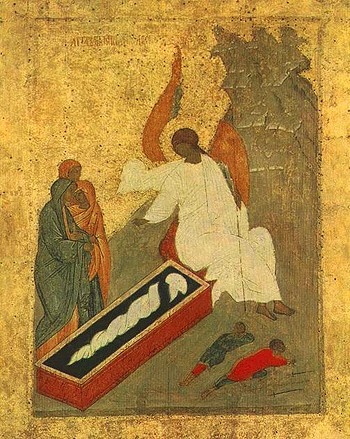 и ви́дѣ два́ А́нгела въ бѣ́лыхъ [ри́захъ] сѣдя́ща, еди́наго у главы́ и еди́наго у ногу́, идѣ́же бѣ́ лежа́ло тѣ́ло Иису́сово.