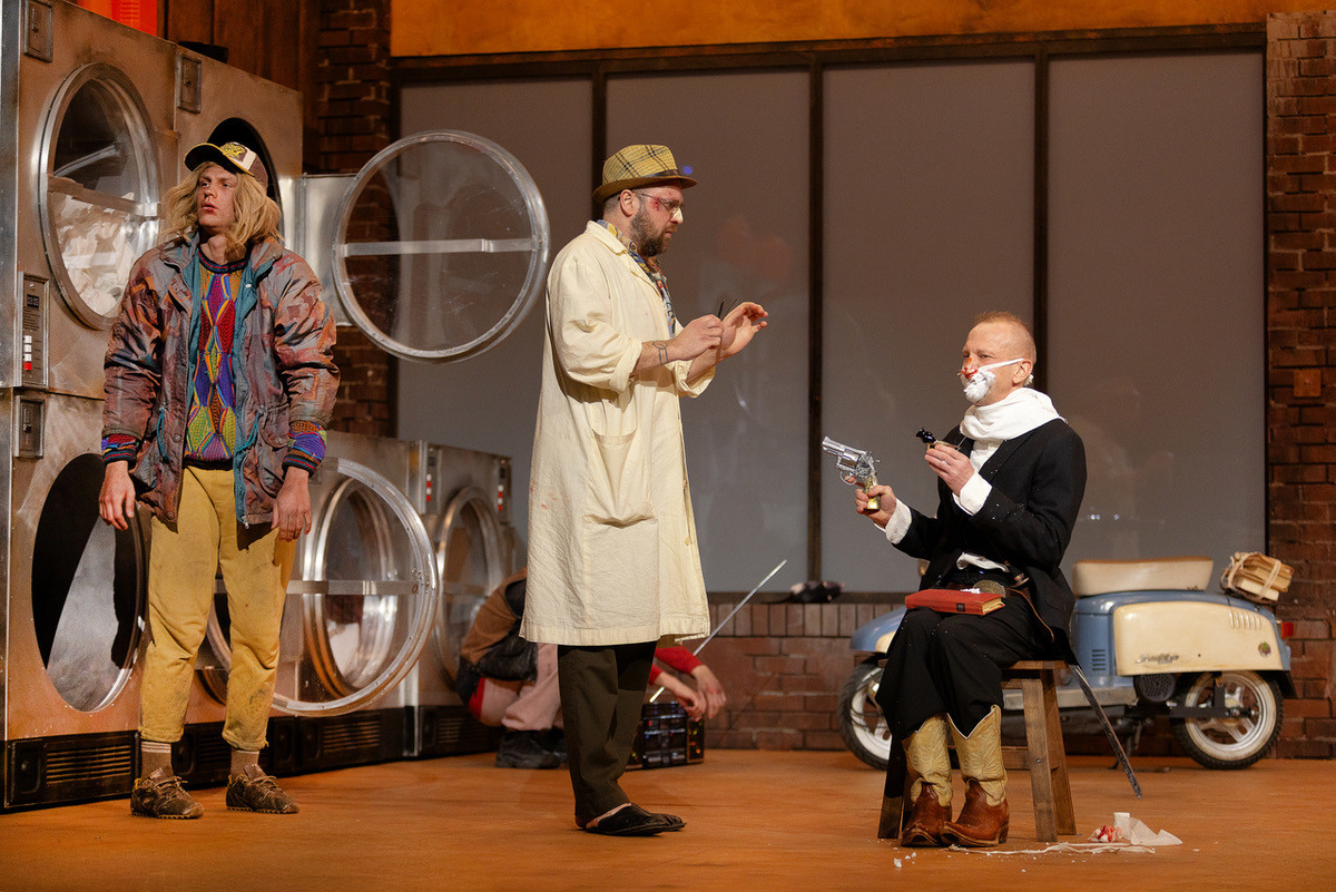 Режиссер Антон Федоров Для начала вынужден предупредить, что этот потрясающе необычный спектакль НЕ РЕКОМЕНДУЕТСЯ к просмотру: - театральным староверам и старожилам; - тем, кто не принимает Трибунцева без штанов; - тем, кто считает грандиозные «Барабаны в ночи» бесполезным дурачеством; - любителям дикторской дикции и актерского художественного слова; - библиофилам, сверяющим тексты театральной версии и оригинального произведения. И так нас осталось мало. И вот вам, дорогие мои, я дам пару своих наблюдений. Это театральный артхаус, где действия героев не линейны и не последовательны. Сама площадка – это «испанская прачечная», где Дон Кихот держит заложников. Кровожадность и садизм героев напоминают тарантиновские картины. Главная реплика Дон Кихота – это лаконичное клоунское «ух-ты». И вообще жанровых перекличек с шоу Полунина и подобных было предостаточно. Санчо Панса, невнятно бормочущий в стиле Лапенко с его огово