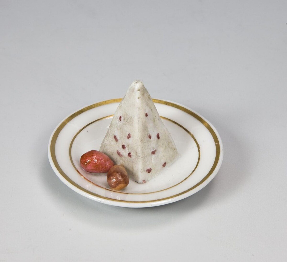 Сувенир на Пасху – миниатюрная тарелочка с лепной пасхой и двумя яйцами. Россия, 2-я половина XIX века, фарфор.