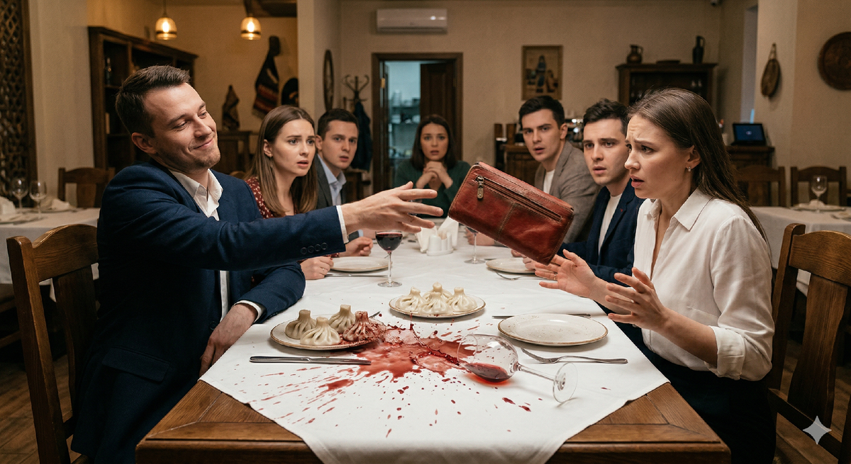 Кошелек ударился о край тарелки с хинкали, подпрыгнул и сбил бокал. Красное вино потекло по белой скатерти, мгновенно впитываясь в волокна и расползаясь неопрятным бурым пятном. Денис даже не вздрогнул. Он сидел, откинувшись на спинку резного стула, и обводил взглядом притихших друзей.