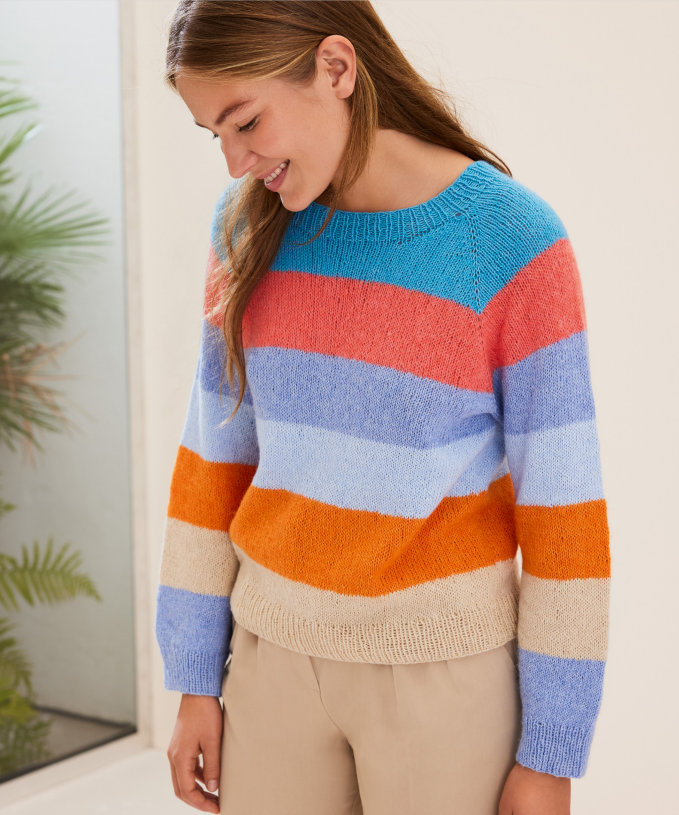 Вещица нашлась в журнале LOOKBOOK № 18 за этот год. Сначала показалось — цвета полос не повторяются, каждый цвет используется один раз. Однако дойдя но линии низа, поняла — видимо, голубой пряжи было больше всего, и именно ею был дописан образ точного совпадения полос. Получилось идеально!