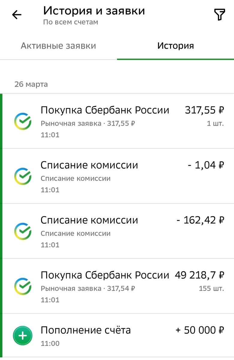 22 марта 2026 года я открыла ИИС в Сбере, а 26 марта пополнила его на 50 тыс. руб. и купила первые акции Сбера. Хватило на 156 шт. Забавно, что платёж по ипотеке у меня тоже 26 числа. Но я это не специально так сделала, просто именно в этот день накопилась круглая сумма в копилке 🙂
