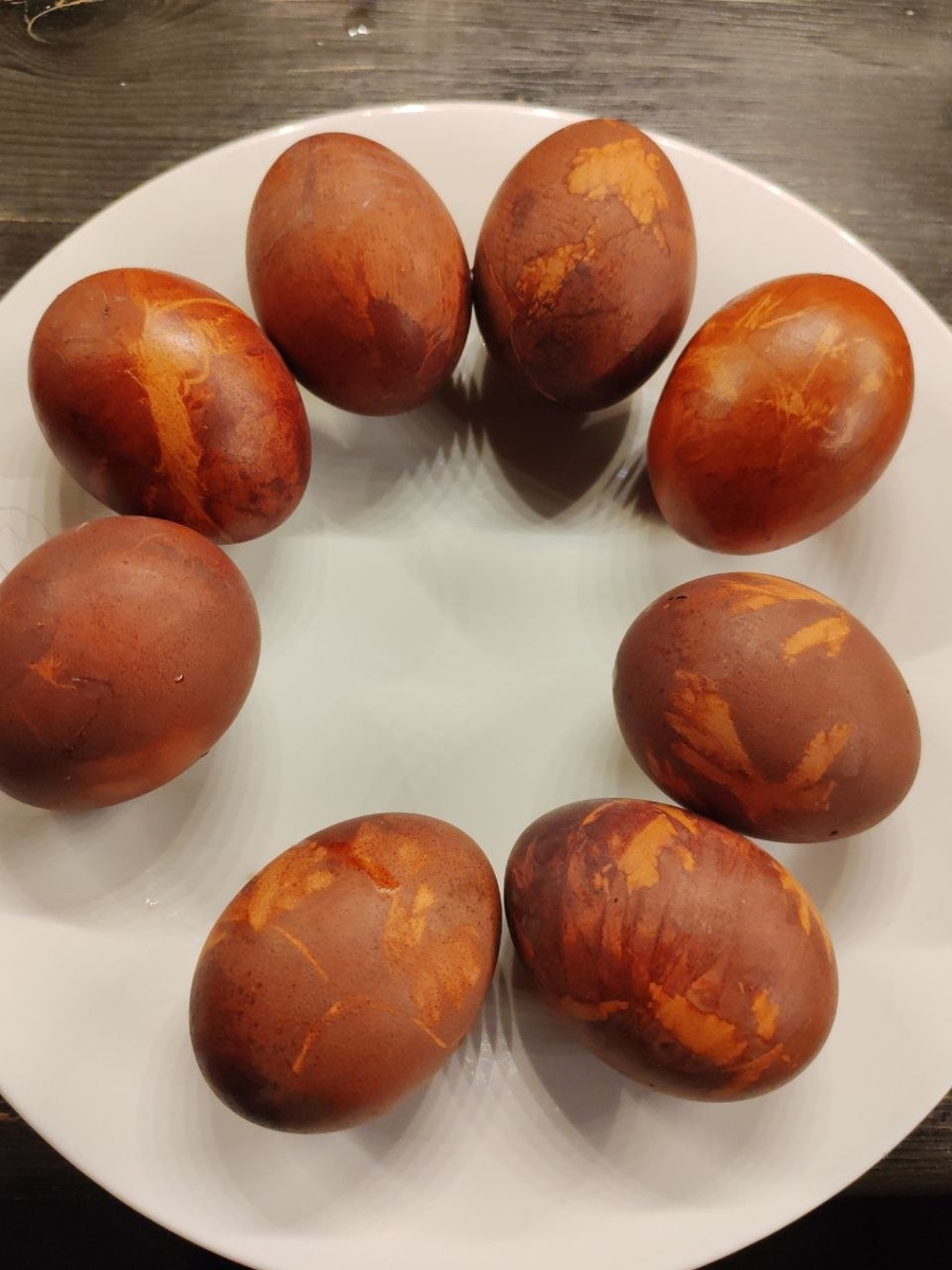 Первый раз в этом году красила с Сашей яйца по бабушкиному рецепту (без колготок правда