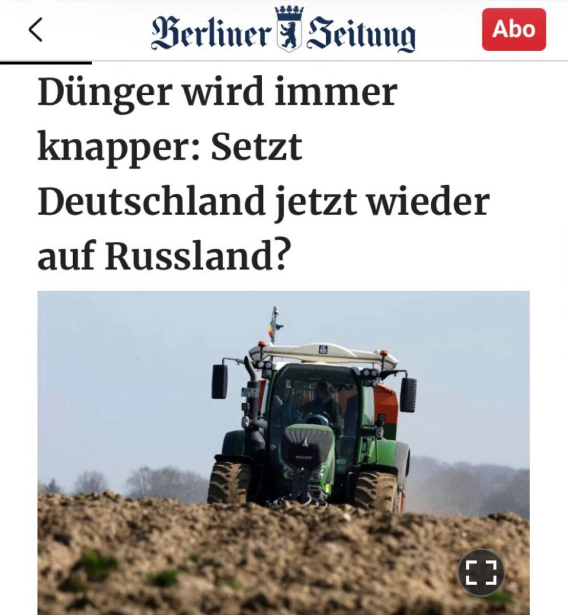 в России из-за войны на Ближнем Востоке. «Кризис вокруг Ирана нарушил поставки удобрений через Ормузский пролив, через который проходит значительная часть мировой торговли. Из-за дефицита цены резко выросли, а Россия предложила компенсировать нехватку своей продукцией. Это создаёт дилемму для Германии, где ранее активно импортировали российские удобрения, но после введения пошлин ЕС такие поставки сократились. Несмотря на рост цен, власти и отраслевые организации считают возвращение к российскому импорту нежелательным. Они подчёркивают, что внутренняя европейская продукция покрывает большую часть спроса, а зависимость от дешёвого импорта может ослабить собственную промышленность и противоречить политике санкций. При этом признаётся, что при дальнейшем обострении кризиса давление на пересмотр этой позиции может усилиться». 🤗 НАСОНОВ ▶️