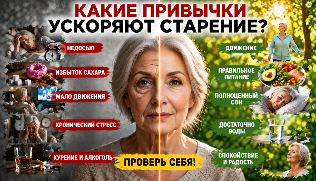 Это процесс, который во многом зависит от того, как мы живём каждый день. И самое важное — многие привычки, которые ускоряют старение, кажутся безобидными. Разберёмся спокойно и по фактам — что именно действительно «старит» организм быстрее. Организм стареет из-за: 👉 И образ жизни напрямую влияет на все эти процессы. Одна из самых недооценённых причин. Если регулярно спать меньше нормы: 👉 Во сне организм «ремонтирует» себя. Без него процессы идут быстрее в сторону износа. Сахар влияет не только на вес. Он: 👉 Это процесс называется гликация — он буквально «старит» ткани. Чем меньше движения: 👉 Организм «затухает», если не используется. Постоянное напряжение: 👉 В итоге организм быстрее изнашивается. Когда питание: 👉 организм тратит ресурсы не на восстановление, а на переваривание И это ускоряет износ. Даже лёгкий дефицит воды: 👉 И ускоряет старение на уровне тканей. Это очевидно, но важно: 👉 Это прямое влияние на продолжительность жизни. Мозг тож