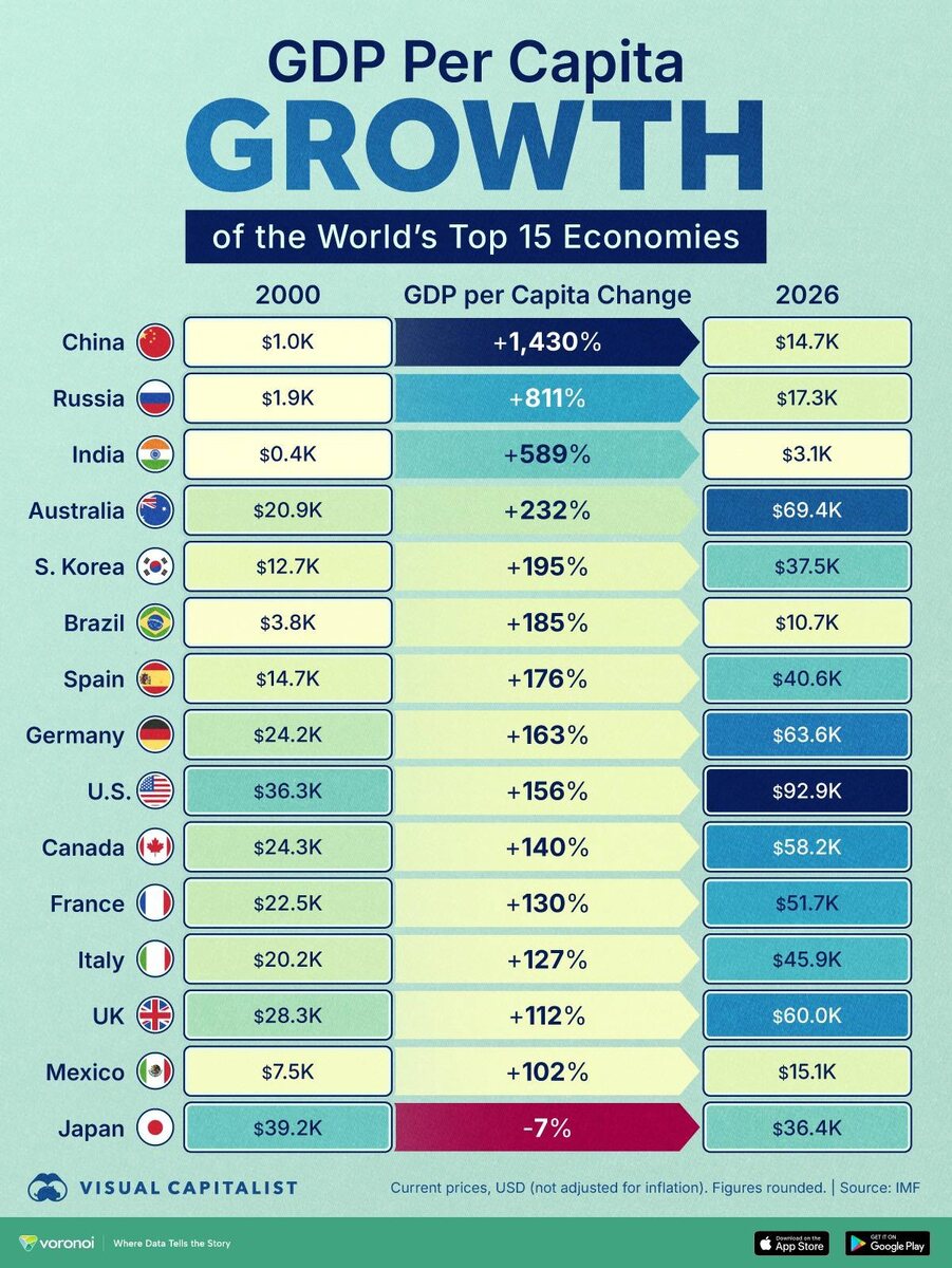 Звучит мощно, но есть нюанс На инфографике Россия выглядит очень бодро: с $1.9k на человека в 2000 году до $17.3k в 2026. Это +811% - один из самых сильных результатов среди крупных экономик. На фоне многих стран цифра реально большая. Но тут важно не влюбиться в процент. Потому что старт был очень низкий. Когда растёшь с почти нуля, проценты всегда выглядят героически. Это как радоваться, что депозит вырос в 10 раз, если он начинался с 100 рублей 😁 Да, Россия выросла сильно. Да, путь прошли большой. Но в абсолюте мы всё ещё сильно ниже: 🇺🇸 США $92.9k на человека 🇦🇺 Австралия $69.4k 🇩🇪 Германия $63.6k 🇬🇧 Британия $60.0k 🇷🇺 Россия $17.3k То есть вывод банальный. Рост был, но до реально богатых стран дистанция всё ещё огромная. И ещё интересный момент. Япония за эти 25 лет вообще ушла в минус 7%. То есть даже богатая и развитая страна не гарантирует себе вечный рост. Мораль для нас простая 🧐 Смотреть надо не только на красивые проценты, а на то, сколько реально приходи