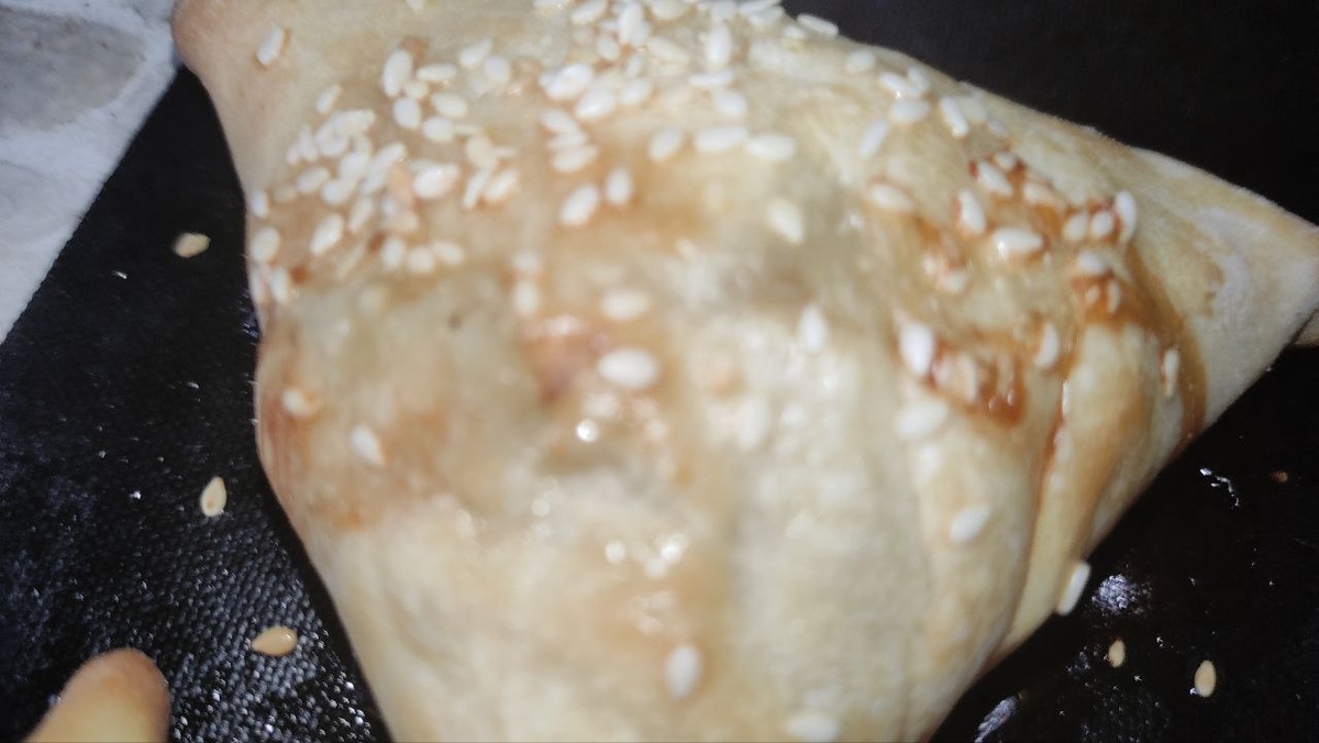 Ингредиенты: тесто: 300 гр. муки, 1 яйцо + 1 желток для смазки щепотка соли, 100 мл. молока, 1 ст. л. растительного масла, 100-150 гр. растопленного сливочного масла, кунжут - по желанию начинка: 300 гр. филе куриного бедра, 250-300 гр. лука, соль, черный молотый перец по вкусу, 100 гр. сала 1. Муку смешать с солью, добавить остальные ингредиенты и замесить эластичное тесто. 2. Тесто накрыть пленкой и оставить в тепле на 1 час. 3. Тесто разделить на 8 частей и сформировать шарики. 4. Шарики расплющить и, обмакнув в растопленное сливочное масло, сложить в глубокую тарелку друг на друга, залив остатками масла. Накрыть пленкой и оставить на 1,5-2 часа. 5. Сало, лук, филе бедра порезать, добавить соль, черный молотый перец - все тщательно перемешать. 6. Лепешки теста максимально тонко растянуть на столе, затем скатать в рулетик, а затем завернуть в улику, конце раскатать в лепешку. 7. На середину каждой лепешки положить начинку и сформировать треугольную самсу. 8. Выложить самсу на проти