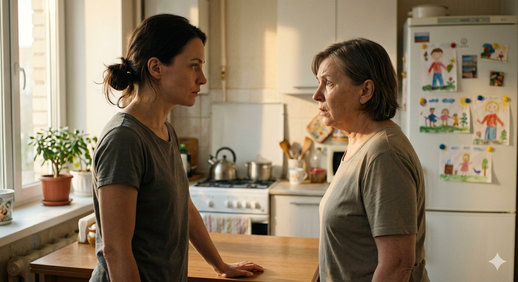 Нет, он не молчал — он говорил. Но говорил то, что ещё хуже молчания. «Мама просто хочет помочь». «Ты слишком остро реагируешь». «Она не со зла». И, конечно, любимое: «Ну потерпи немного, она же не вечно будет приходить».