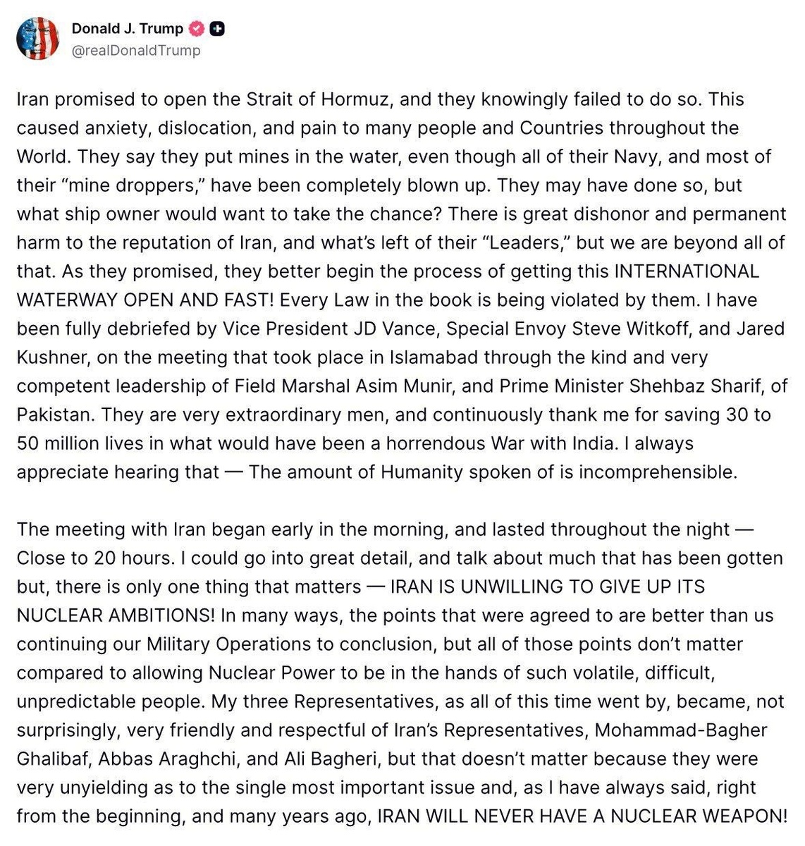 Что болезненно отразилось на многих народах и странах по всему миру. Они говорят, что заминировали пролив, хотя весь их флот и большинство их минных заградителей взлетели на воздух. Впрочем, кто же из судовладельцев захочет рисковать? Все это позор и потеря лица для Ирана и репутации их оставшихся в живых «лидеров». Советую им наконец и незамедлительно разблокировать, как они и обещали, пролив, который лежит В МЕЖДУНАРОДНЫХ ВОДАХ! Они нарушили все и всяческие законы. Я был всецело проинформирован вице-президентом Джей Ди Вэнсом, спецпосланником Стивом Уиткоффом и Джаредом Кушнером о прошедших в Исламабаде переговорах, благодаря посредничеству уважаемых фельдмаршала Асима Мунира и премьер-министра Пакистана Шебаза Шарифа. Это прекрасные люди, которые по сей день признательны мне за то, что я спас от 30 до 50 миллионов жизней, предотвратив их потенциально кошмарную войну с Индией. С благодарностью принимаю такое к себе отношение. Встреча с Ираном началась рано утром и продлилась до самой