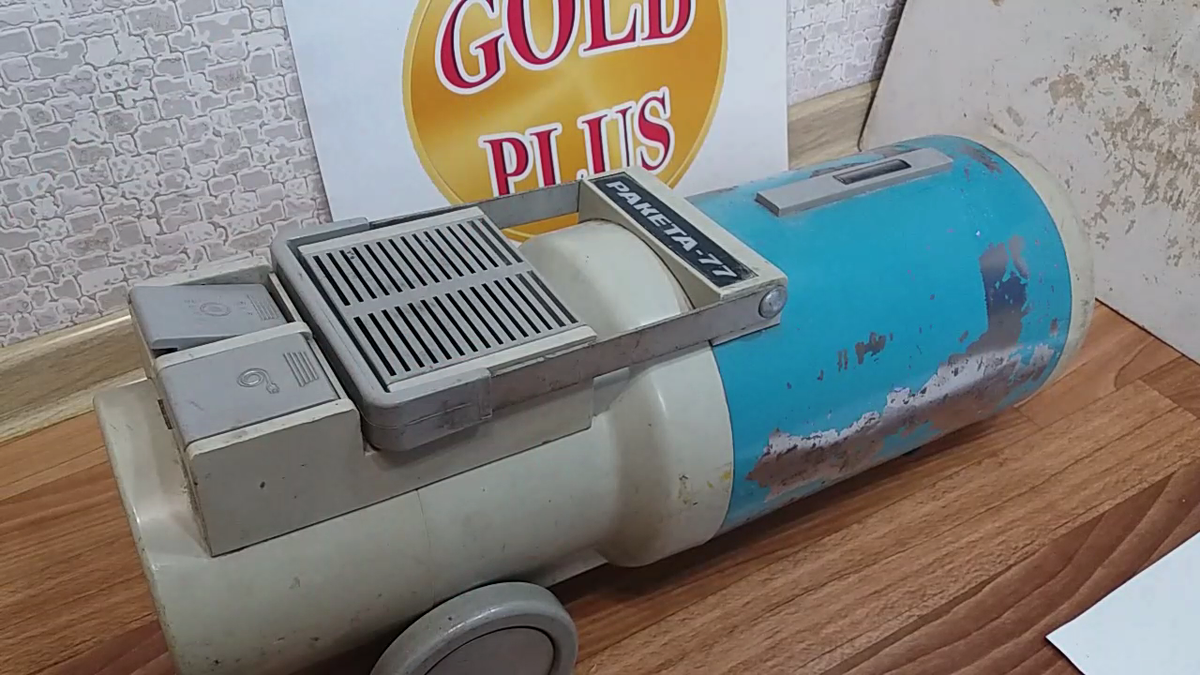 Вот пожалуй и всё что знаю об этом чуде выпускавшемся на Ульяновском заводе «Электромаш», на это указывает приклёпанный алюминиевый шильдик, уже изрядно затёртый. Достался мне бесплатно этот старичок из прошлого века, хозяева выбросили за ненадобностью в мусор. Там его и обнаружил, шнур конечно уже срезали мои конкуренты охотники за цветным металлом, медь то в цене только растёт! Ну да бог с ним, остальное видно их не заинтересовало, а между тем, этот наполовину стальной пылесос содержит много чего интересного, об этом и пойдёт рассказ в этой статье. Конечно нужно фото для понимания, как он выглядел. Вид у него потрёпанный жизнью. Третьего опорного колеса нет, отвалился от времени , осталось только дыра, краска местами слезла, приёмный барабан сетевого провода сломан, очевидно от времени лопнула возвратная пружина, кнопка включения сломана, видно на фото, приёмного мешка сбора пыли нет. Произвёл замер сопротивление мультиметром чтобы проверить жив ли двигатель, по прибору обры
