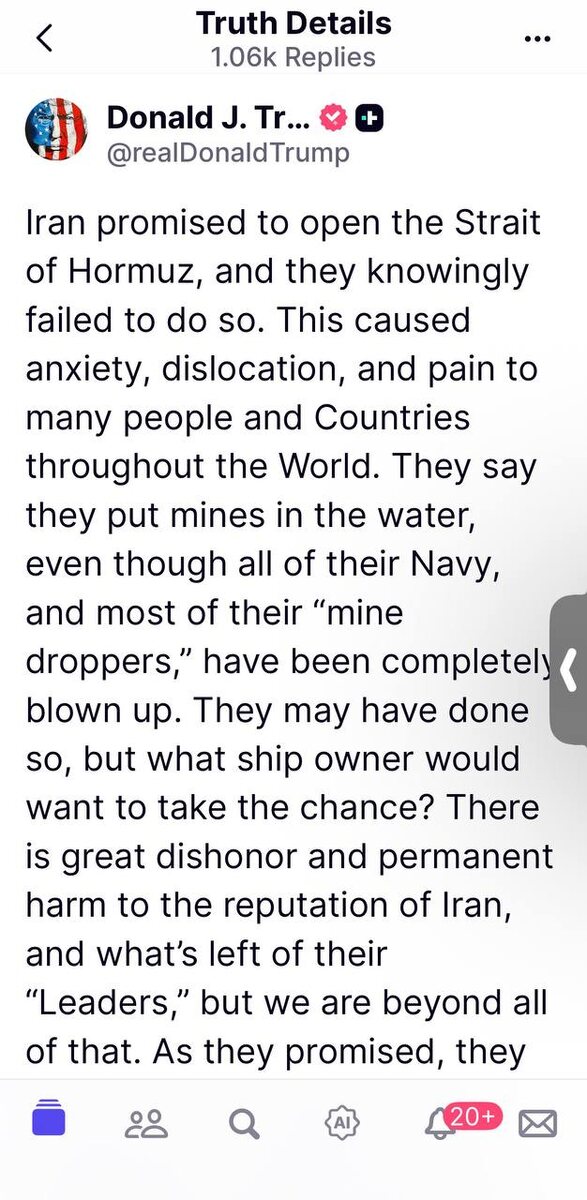 Судите сами: Иран обещал открыть Ормузский пролив, и они сознательно этого не сделали. Это вызвало тревогу, потрясения и боль у многих людей и стран по всему миру. Они говорят, что заложили мины в воду, хотя весь их военно-морской флот и большинство их "минных заградителей" были полностью уничтожены. Возможно, они это и сделали, но какой судовладелец захочет рисковать? Репутации Ирана и тому, что осталось от их "лидеров", нанесен огромный позор и непоправимый ущерб, но мы уже выше этого. Как они и обещали, им лучше начать процесс открытия этого МЕЖДУНАРОДНОГО ВОДНОГО ПУТИ И БЫСТРО! Ими нарушаются все писаные законы. Вице-президент Джей Ди Вэнс, специальный посланник Стив Виткофф и Джаред Кушнер полностью доложили мне о встрече, которая состоялась в Исламабаде благодаря доброму и очень компетентному руководству фельдмаршала Асима Мунира и премьер-министра Пакистана Шехбаза Шарифа. Они очень выдающиеся люди и постоянно благодарят меня за спасение от 30 до 50 миллионов жизней в том, что