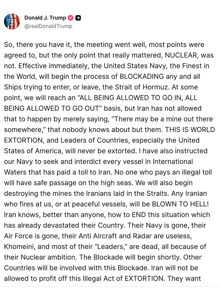 Это был второй твит. А вот про саму блокаду : Вот так, встреча прошла хорошо, по большинству пунктов удалось договориться, но по единственному действительно важному вопросу, ЯДЕРНОМУ, - нет. С этого момента Военно-морские силы Соединенных Штатов, лучшие в мире, начнут процесс БЛОКИРОВАНИЯ любых кораблей, пытающихся войти в Ормузский пролив или выйти из него. В какой-то момент мы придем к принципу "ВСЕМ РАЗРЕШЕН ВХОД, ВСЕМ РАЗРЕШЕН ВЫХОД", но Иран не позволил этому случиться, просто сказав: "Где-то там может быть мина", о которой никто, кроме них, не знает. ЭТО МИРОВОЕ ВЫМОГАТЕЛЬСТВО, а лидеры стран, особенно Соединенных Штатов Америки, никогда не поддадутся вымогательству. НАСТОЯЩИЙ МАТЕРИАЛ (ИНФОРМАЦИЯ) ПРОИЗВЕДЕН, РАСПРОСТРАНЕН И (ИЛИ) НАПРАВЛЕН ИНОСТРАННЫМ АГЕНТОМ ГУРЕВИЧЕМ МИХАИЛОМ ЛЕОНИДОВИЧЕМ, ЛИБО КАСАЕТСЯ ДЕЯТЕЛЬНОСТИ ИНОСТРАННОГО АГЕНТА ГУРЕВИЧА МИХАИЛА ЛЕОНИДОВИЧА. Я также поручил нашим ВМС искать и перехватывать в международных водах каждое судно, которое заплатило пошлину