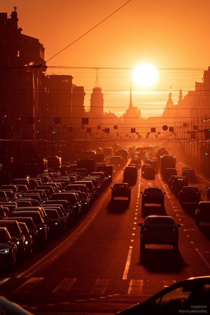 Невский проспект таит в себе особенный ракурс, который дважды в год превращается в место встреч фотографов и охотников за закатами: солнце опускается точно в створ проспекта, превращая его в пылающий золотой коридор. Вот уже три года подряд, в апреле и сентябре, я неизменно возвращаюсь на эту точку, и каждый раз как в самый первый. Тут важен даже не результат, а сам процесс: удивительно видеть, как на небольшом пятачке земли без всяких договоренностей собираются десятки незнакомых людей, объединенных одной целью. В этой компании фотографов всегда царит особая атмосфера. В этот раз захотелось выйти за рамки привычного и поэкспериментировать с масштабами: поднимал камеру на практически пятиметровую высоту, стараясь взглянуть на город с высоты птичьего полёта, опускался к самой земле, пытаясь поймать мимолетные силуэты прохожих в лучах заходящего солнца. Эксперименты с высотой и силуэтами прохожих позволили в этот раз увидеть знакомый сюжет по-новому, однако какой бы ни была точка съемки,
