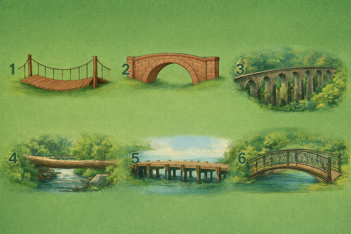 Давайте попробуем честно заглянуть внутрь себя. В жизни нас от настоящих желаний часто отделяют не только внешние обстоятельства — время, деньги или расстояние. Гораздо чаще это внутренние барьеры. Кто-то боится проиграть и поэтому даже не делает шаг к лучшей жизни. Кому-то в детстве «подрезали крылья» — критикой, запретами, установками вроде «не высовывайся» или «будь как все». А кто-то настолько привык быть удобным для других, что уже не слышит собственных желаний. Предлагаю вам небольшой тест. Посмотрите на картинку и выберите мост, который вам откликается больше всего — не раздумывая, интуитивно. Затем прочтите описание ниже. Если вы выбрали подвесной мост — значит, в вас есть смелость и стремление к переменам, но рядом с этим живет тревога. Вы часто стоите на пороге — будь то новая работа, переезд или даже разговор в отношениях — и начинаете сомневаться: «А вдруг не получится? А вдруг я ошибусь?» Из-за этого вы можете годами оставаться в неудобной ситуации: терпеть холод в отношен