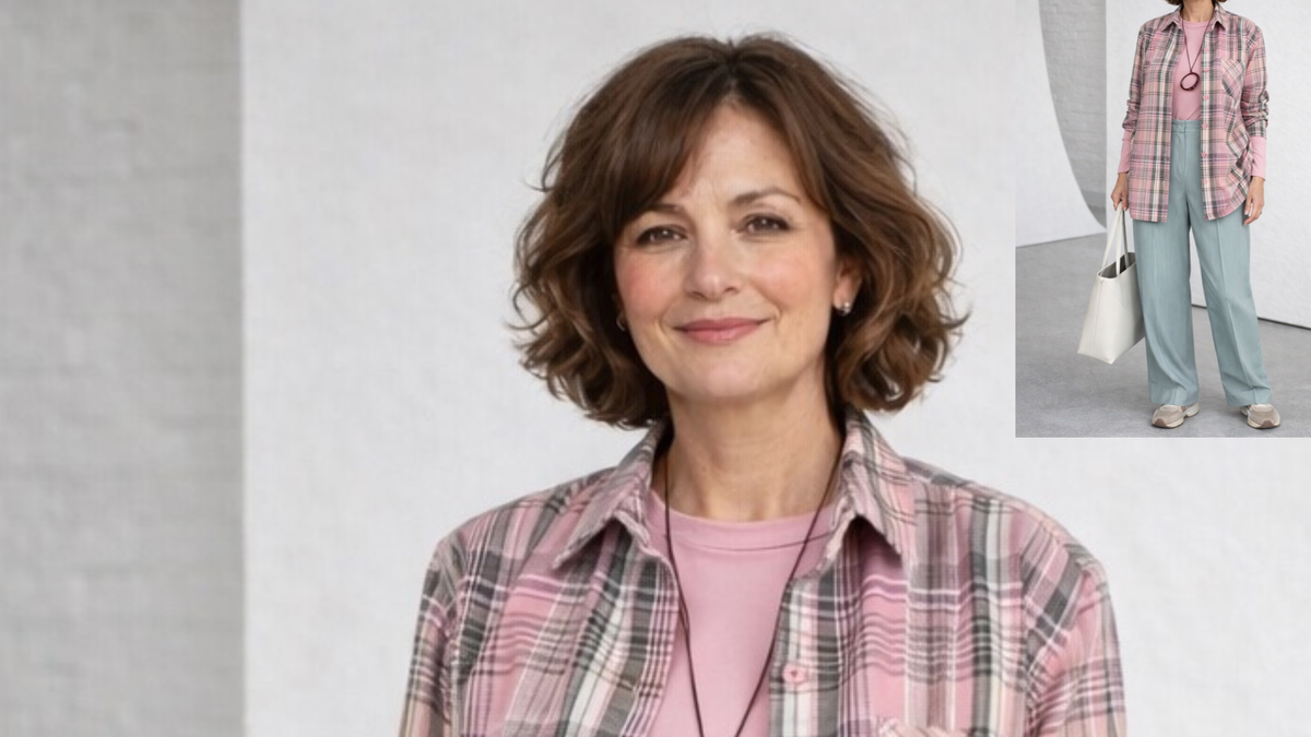 Третий комплект — хороший пример того, как вещи по отдельности могут быть нормальными, а вместе уже начинают путать впечатление. Верх здесь мягкий, спокойный, чуть уютный. Та же клетчатая рубашка, тот же розовый тон, та же расслабленная подача. А низ — уже из другой истории. Бордовые брюки с лампасами тянут комплект в сторону спортивного ритма. И получается, что образ не разваливается совсем, но и не собирается в одно ясное настроение.