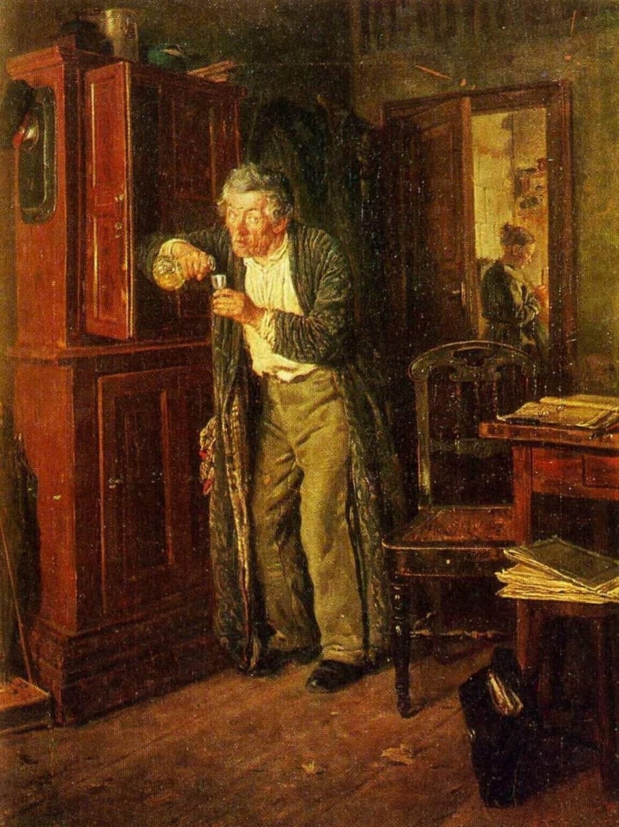 ». Это не просто картина, а настоящая хроника семейной жизни! 😄 На ней изображен герой, который, будучи маленьким, тайком пожирал сладости, а теперь, став взрослым, прячется от жены и прикладывается к графину с водкой. Вот это поворот! Скорее всего, перед нами мелкий чиновник с такой зарплатой, что его семья экономит на всем, включая радости жизни. Он взял работу на дом, но, похоже, что жажда и графин с водкой отвлекают его больше, чем домашние обязанности. Как же сложно быть взрослым, когда у тебя есть такие «вкусные» соблазны! 🍷