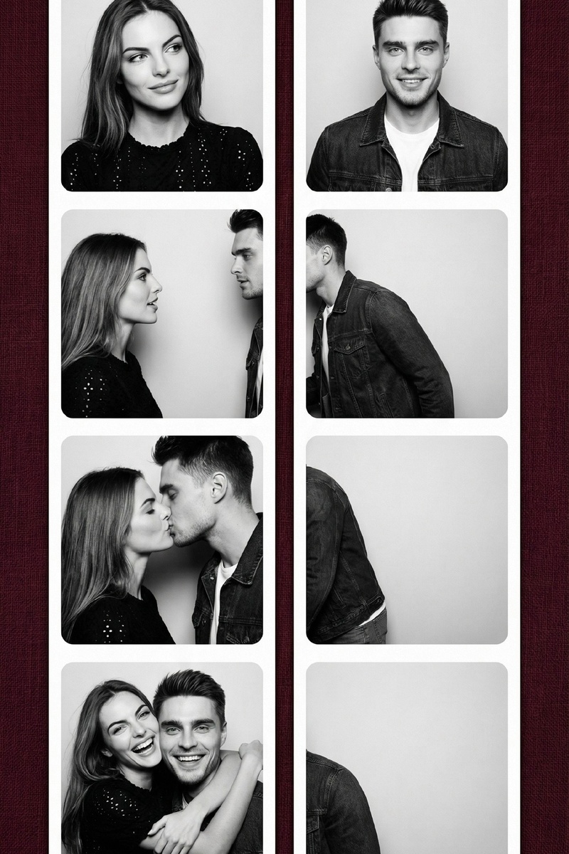 1) Заходим в БОТ ВК 2) Жмем Выбор модели => Nano Banana PRO/Nano Banana 2 3) Добавляем свой фото (важно фото БЕЗ ретуши и любой обработки и фильтров), вставляем этот ПРОМТ: Вертикальный коллаж, состоящий из двух черно-белых полосок фотобумаги, расположенных в центре на фоне льняной текстуры насыщенного темно-бордового цвета. Коллаж состоит в общей сложности из 8 кадров, расположенных в две параллельные вертикальные колонки по 4 штуки в каждой, с чистыми белыми рамками и слегка закругленными углами.