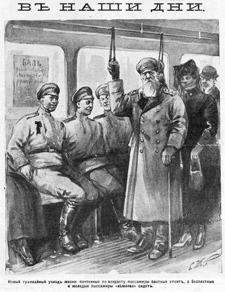 «Новый трамвайный укладъ жизни: почтенные по возрасту пассажиры платные стоятъ, а бесплатные и молодые пассажиры «вежливо» сидятъ». Карикатура на «новые нравы», Петроградская газета, осень 1917 года.