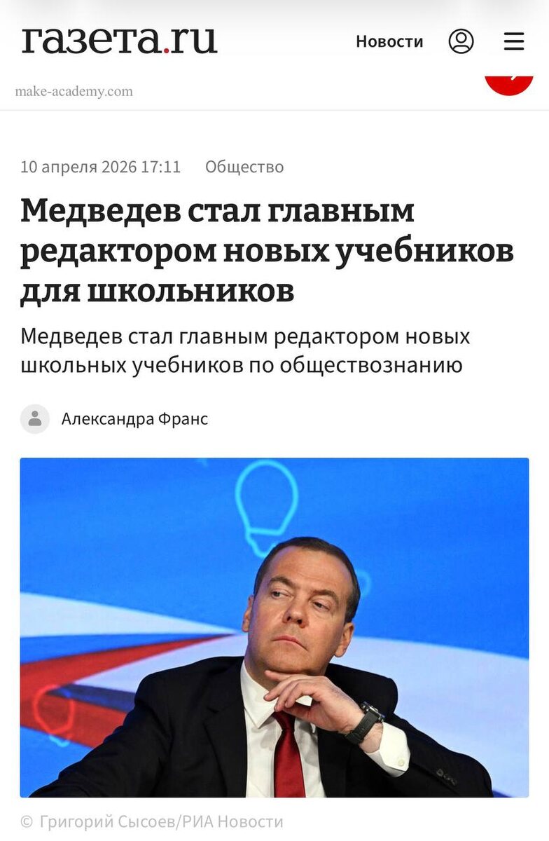https://www.gazeta.ru/social/news/2026/04/10/28243147.shtml Сюр ситуации в том, что по образованию Медведев - ЮРИСТ. Для того чтобы учебник был принят, над ним работает комиссия из НЕСКОЛЬКИХ человек с ПЕДАГОГИЧЕСКИМ образованием и со знанием не столько предмета, сколько МЕТОДОЛОГИИ обучения этому предмету. Раньше учебники согласовввались УЧЕНЫМИ, а теперь схлопнулись до ОДНОГО человека, который не имеет никакого отношения к образованию. 🙋♀️ Кто раньше занимался согласованием учебной литературы в стране: 1. Российская академия образования 2. Федеральный институт педагогических измерений 3. Министерство образования Сейчас же - человек из политических кругов 🫣 Самое интересное, что чтобы переделать такие научные труды как ИСТОРИЯ , ЭКОНОМИКА И ОБЩЕСТВОЗНАНИЕ нужно время … ведь только на долгой дистанции можно качественно изучить факты и изменения, выявить закономерности, сделать выводы и принять новые правила. ✌️ По факту : мы живем В ПУЧИНЕ СОБЫТИЙ, которые не пришли к финалу