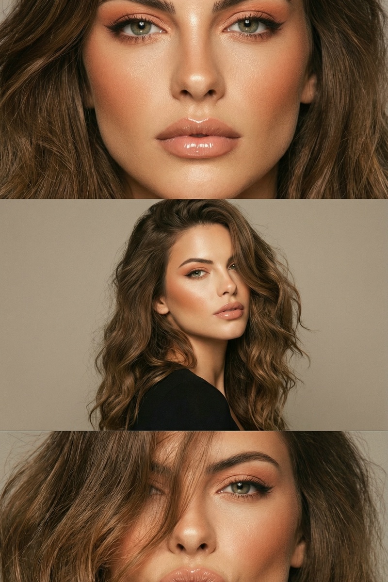 Во всех трёх кадрах одна и та же модель — молодая женщина со светлой кожей и длинными густыми волнистыми волосами. Вайб — глянцевый «beauty/glam», высокая детализация кожи и макияжа. Внешность и макияж (общие детали): Выразительный взгляд.