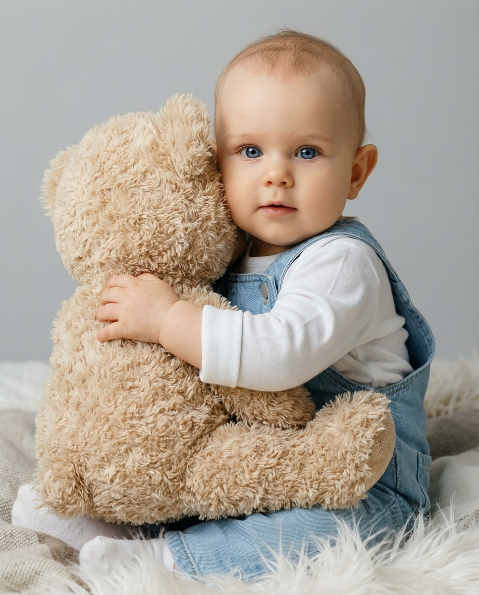 Не меняя внешности ребенка с фото, маленький малыш с ярко-голубыми глазами сидит, обнимая большого плюшевого медвежонка с густым бежевым мехом. Ребенок повернут слегка вправо, его левая рука охватывает мягкое тельце игрушки,