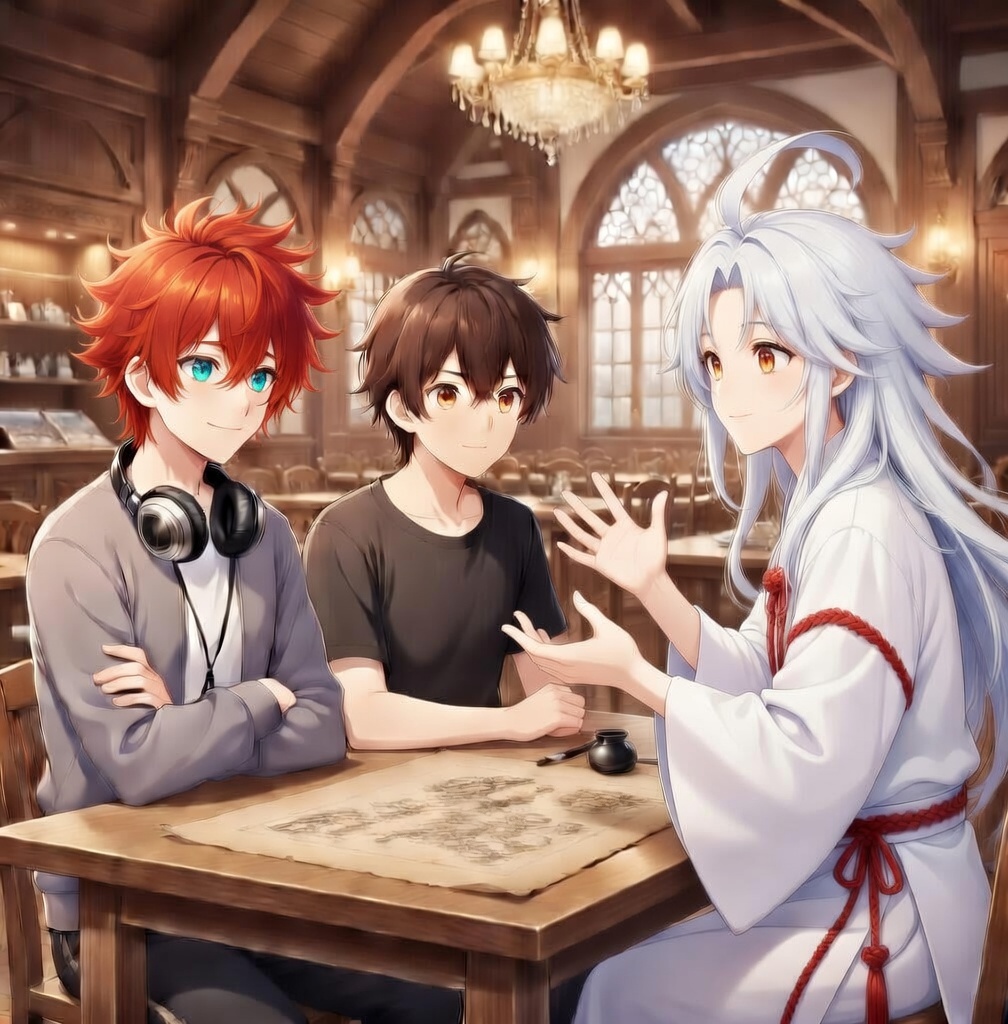 Но заметив на лице рыжеволосого парня куда больший интерес к недоеденной еде, Дао осознал проблему. Он достал из широких рукавов небольшой лист пергамента, скрученный в рулон и аккуратно перевязанный голубой ленточкой, а следом — кисть и небольшую чернильницу. Расположив всё необходимое на столе, он заметил, что заинтересовались уже оба - и Мицу, и я.