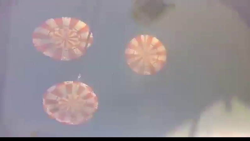 И, смотрите, на этой же секунде, в видео влезает кадр уже с распускающимися первыми двумя парашютами. Теперь, когда мне прислали и полное 25-минутное видео этой «посадки Ориона», у меня к этому кадру уже претензий нет, ибо стало понятно, что это — склейка двух разных кадров для создания «короткого» варианта видео, для самых слепо верующих. Также стало понятно, почему при резкой смене кадров для них же наложили и звуковую дорожку, явно записанную позже. Ведь если мы склеиваем разные куски, то и звук тоже будет изменяться, если он родной и записан во время съемки видео. А когда же они успели обработать видео в более короткий вариант? Значит. это кадры «возвращения Ориона» были записаны гораздо раньше, чем нам говорят.