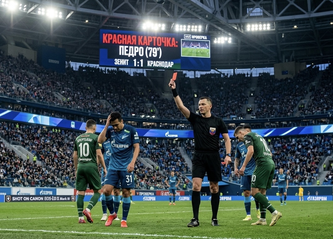 Матч 24-го тура РПЛ между «Зенитом» и «Краснодаром» оправдал ожидания болельщиков, подарив не только накал борьбы, но и один из самых обсуждаемых судейских эпизодов сезона. На 79-й минуте нападающий петербуржцев Педро получил прямую красную карточку, оставив свою команду в меньшинстве в самый ответственный момент при счете 1:1.